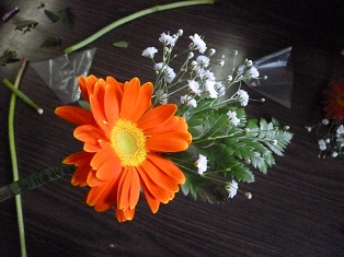 コサージュが胸ポケットに入るようにガーベラ(花)の長さを調整したり、カスミソウやレザーファンを取り入れることにより、コサージュを大きく見せる工夫