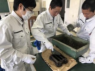 写真は、ネシブを簡易モルタルに混ぜて供試体を作成しているところです