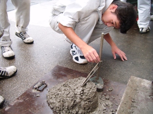 示方配合絵文字:実験 理科をもとに各班で材料を測り、手練りでコンクリートを作製しました絵文字:笑顔。水の量を各班で調整し、スランプ値などを確認しました。今回作製した供試体は、28日後、実験に使用します!