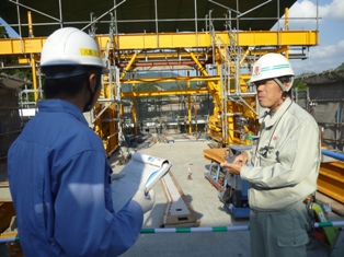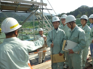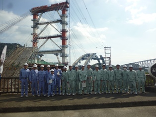 ◎ 熊本3号町中第2橋上部工事の現場では、ポストテンション方式の工法の説明を受け