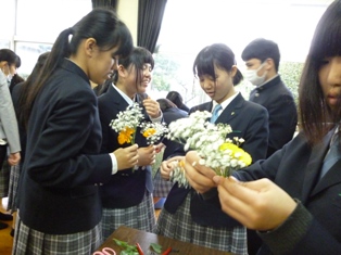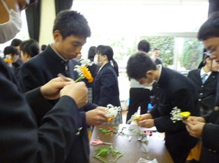 明日の入学式に備えて、三部会(生徒会・農業クラブ・家庭クラブ)の役員が新入生がつけるコサージュを作りました。