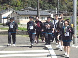 天草青年の家から4kmの道のりを集団で歩き、ペーロンを体験して、約13kmの道のりをウォークラリーしました