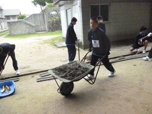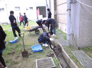 活動では、園芸科学科が集いの広場の花壇の管理、食品科学科、農業工学科、福祉家庭科が、屋内グラウンドの溝掃除、除草作業を行いました
