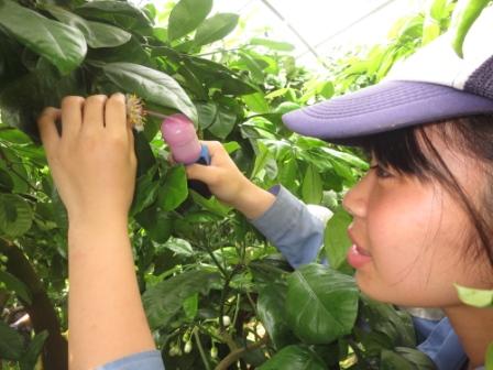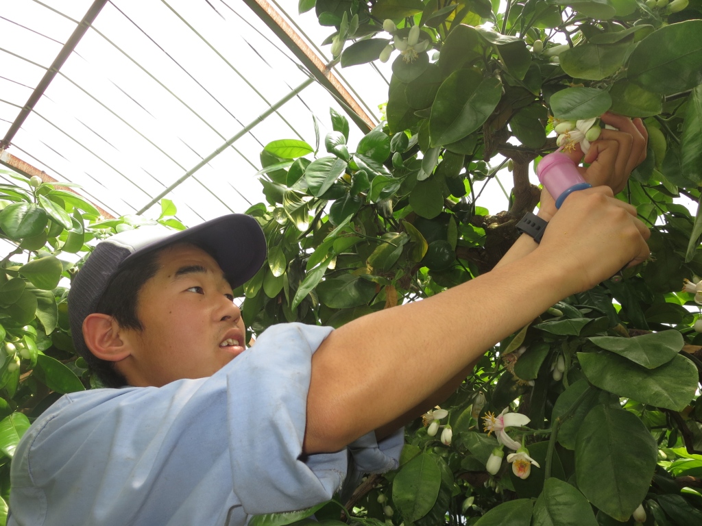 麻豆文旦の花粉を果樹専攻生が丁寧に受粉させます。