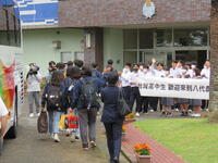 まず、本校の3部会(生徒会、農業クラブ、家庭クラブ)の生徒がお出迎えしました。