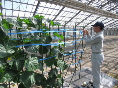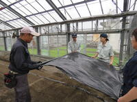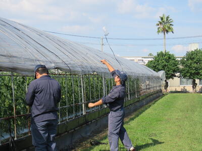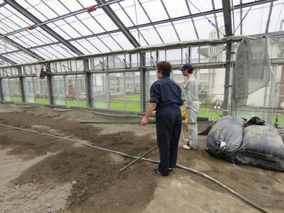 今日はビニールが飛んでいかないように、3年野菜専攻生がハウスバンド張りをしました