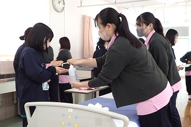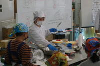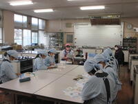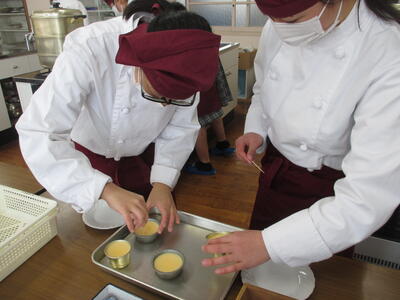 ケチャップを瓶に入れる実習(充てん実習)を生徒達が行っています。