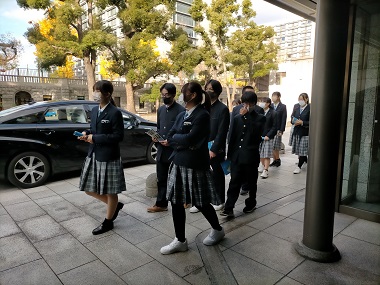 ニュースでよく見る建物の前で集合写真を撮影しました
