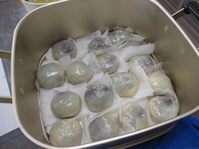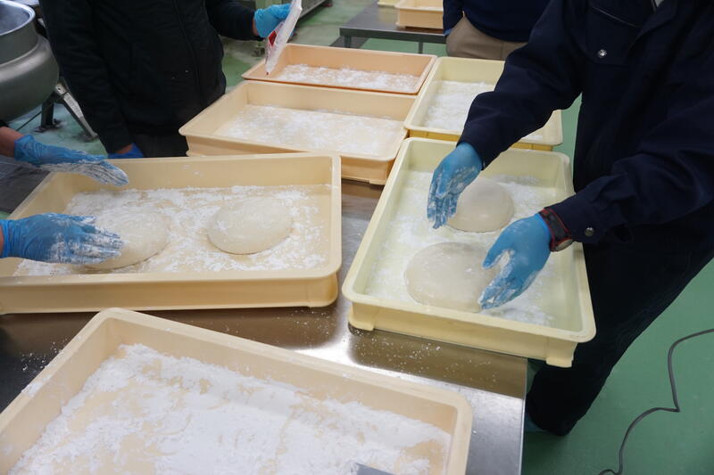 パン生地に、クッキー生地を乗せてメロンパンを作っていきます。(写真は、生地の分割です)