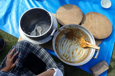 風船をふくらませて、中に小麦粉を入れます。上手に入れるのが意外と難しい。
