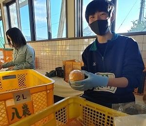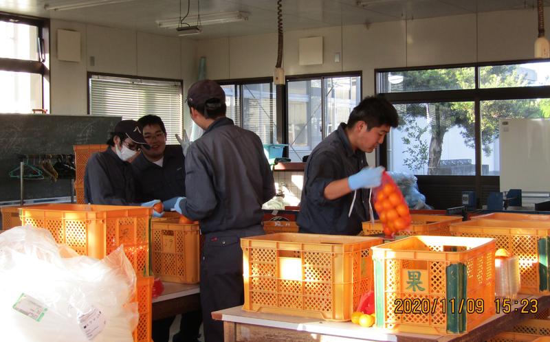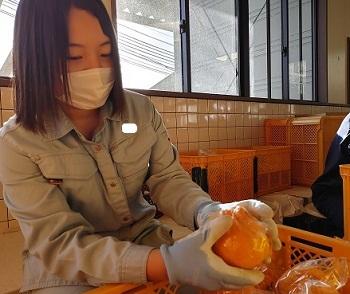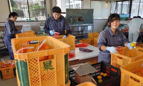 ミカンをサイズごとに生徒たちがネットに詰めていきます。