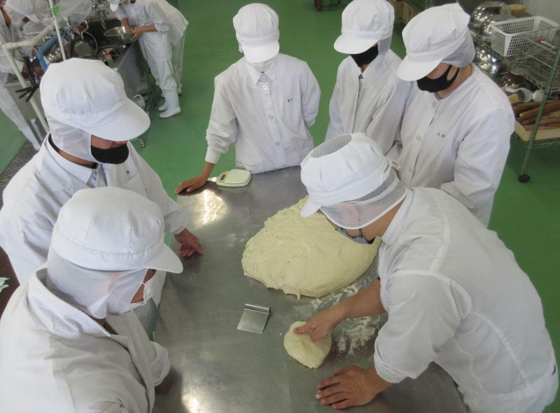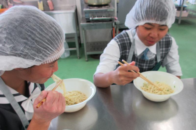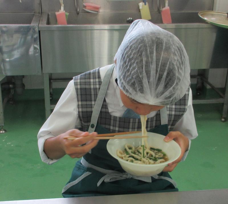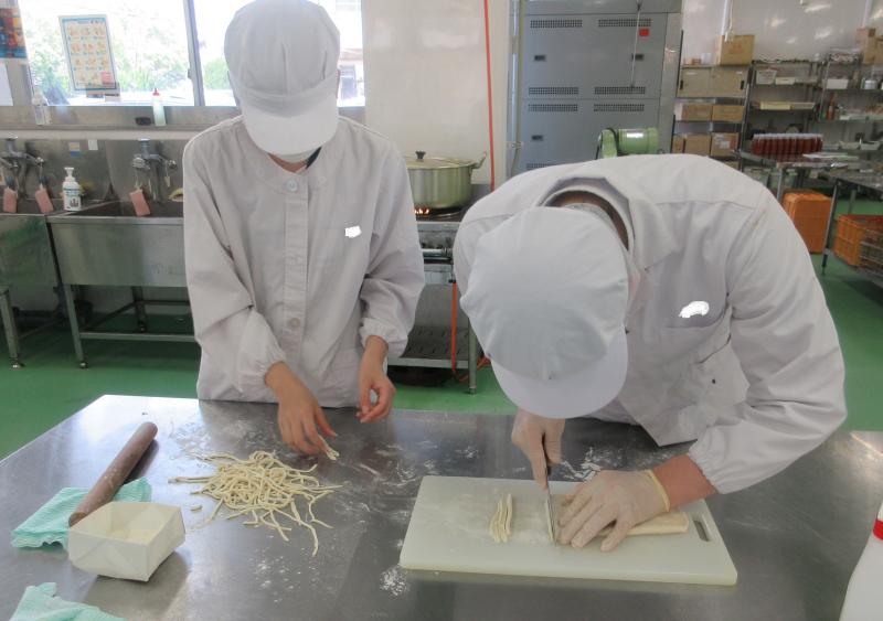 5月31日(月)3年食品科学科の生徒たちが、手でこねたり、袋に入れて足で踏んだりしてうどんを製造しました。細く切るのに苦戦しましたが、なかなかこしのあるうどんが茹で上がりました。 生徒たちはそこら辺のうどんより美味しいといって食べていました。