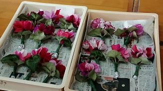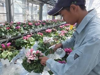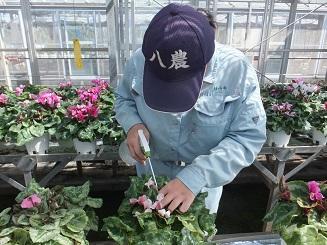 シクラメンの栽培において大切な管理作業の一つである植物ホルモン処理を行いました。これにより、新しい葉や花芽が発生しやすくなり、ボリュームアップにつながります。