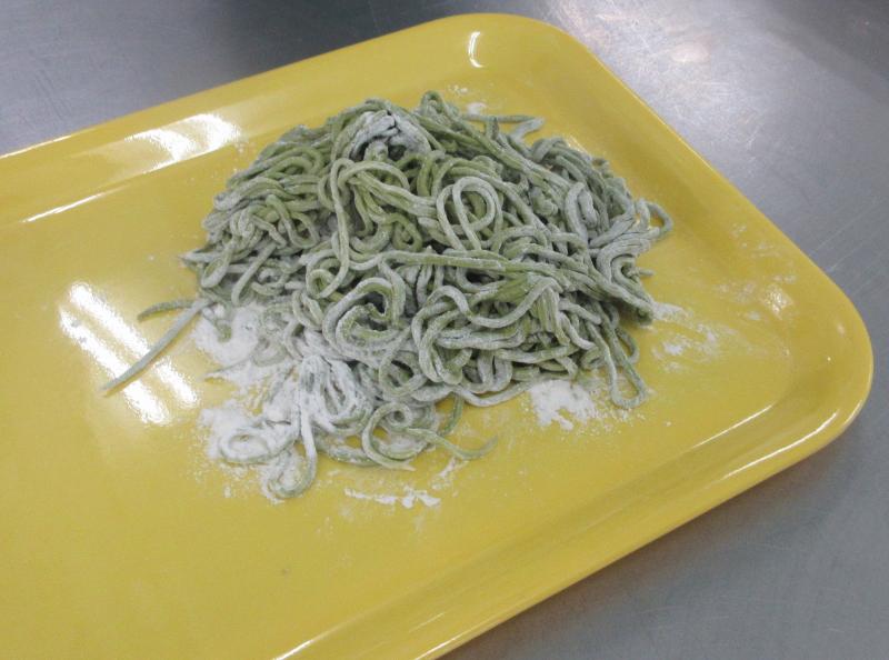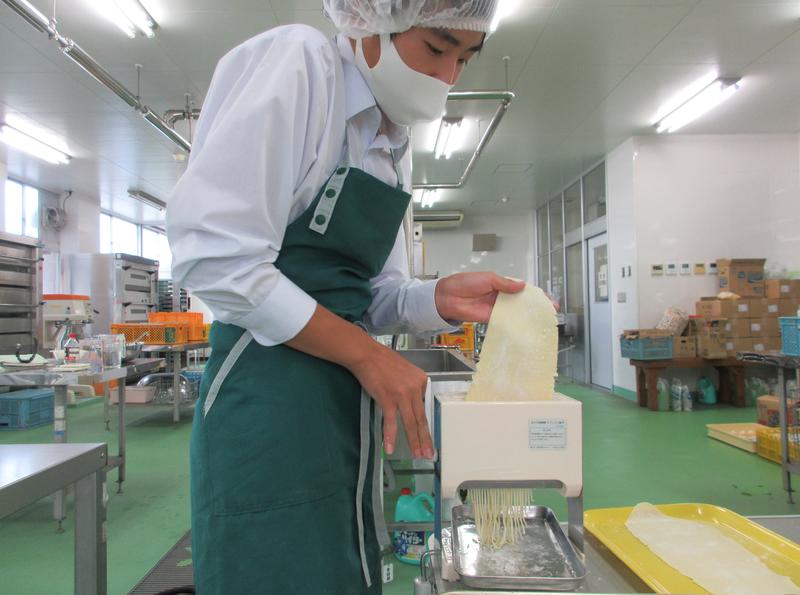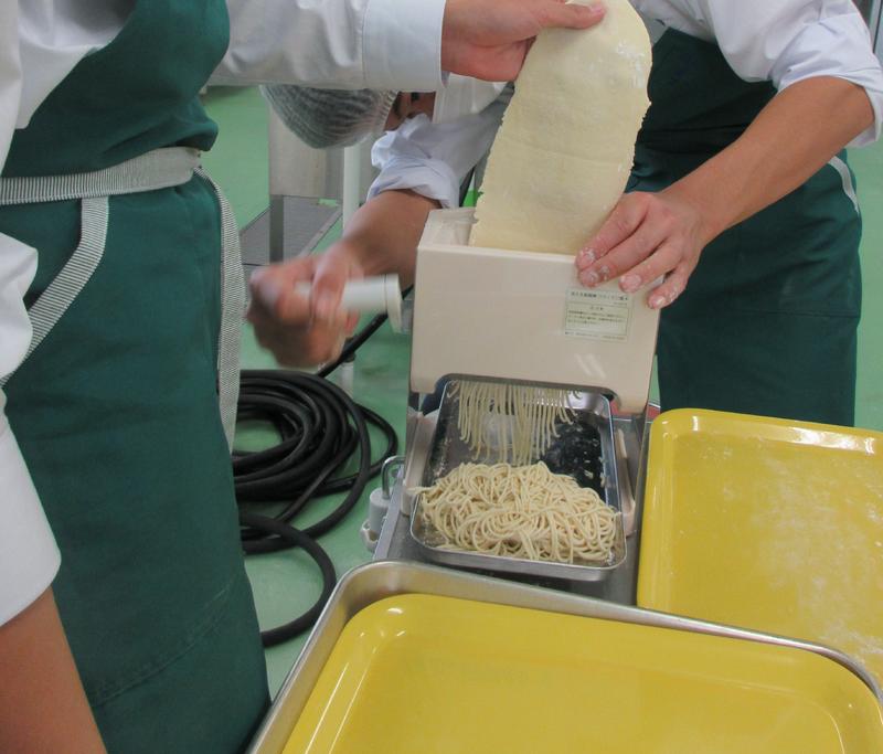 1年園芸科学の生徒たちは、先週うどんを製造しましたが、本日28日は、かん水(食品添加物)を利用した麺作りを行いました。かん水の影響で黄色い麺ができ、製麺機を通すと細く切れた麺に仕上がりました。