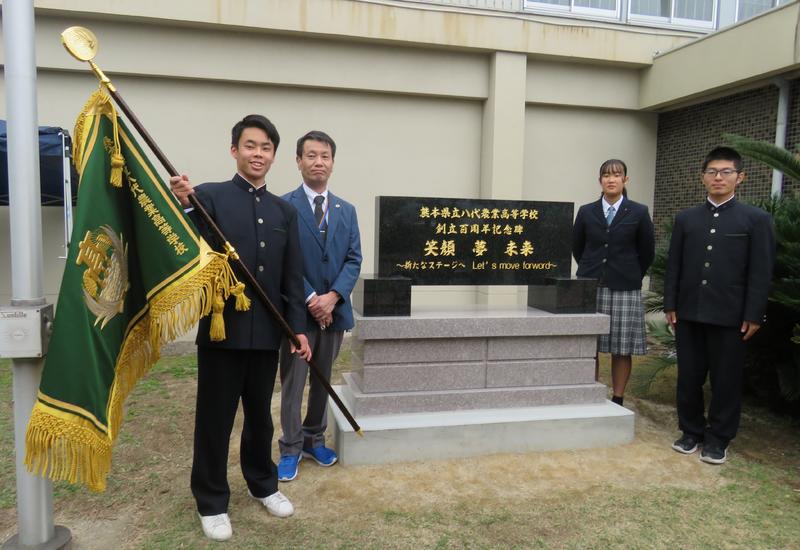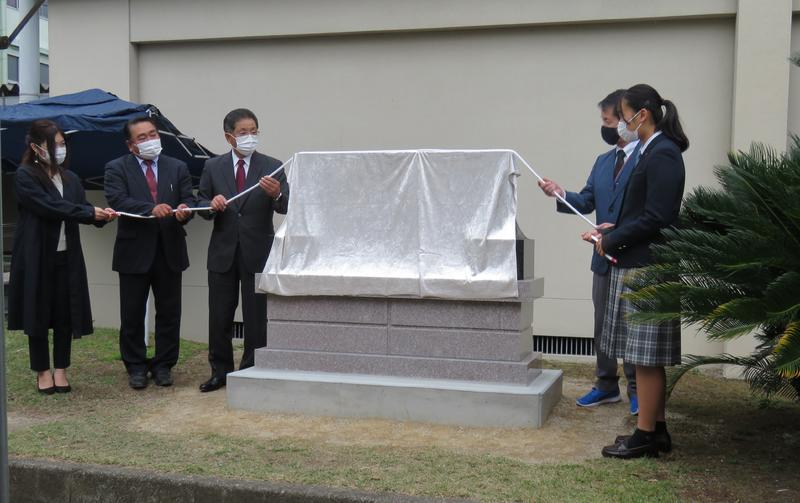 11月6日、本来であれば記念式典が盛大に開催され、除幕式を迎えるところでしたが、新型コロナウイルス感染拡大防止のため、記念式典は令和3年7月19日に開催されることとなり、本日は記念碑の完成除幕式と新調した校旗の披露を行いました。