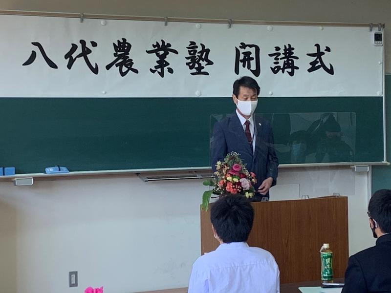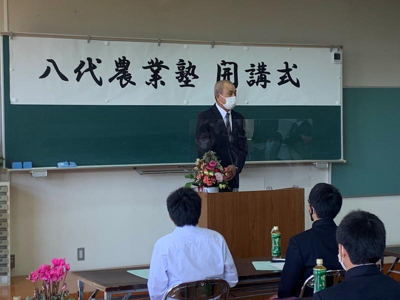 11月21日10時から、本校農場センターで「八代農業塾」の開講式が行われました。主催者として、塾長の市長(代理副市長田中浩司様)と本校校長、農林水産部長 沖田良三様に政策課課長、来賓として県南広域本部 農林水産部長 高野 真様 並びに八代市担い手育成協議会の皆様においでいただきました。