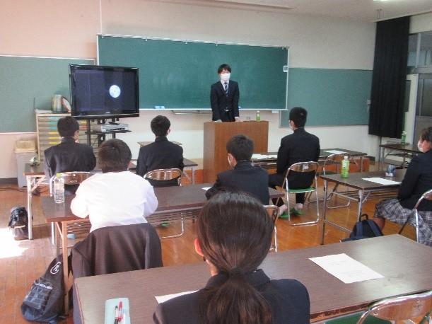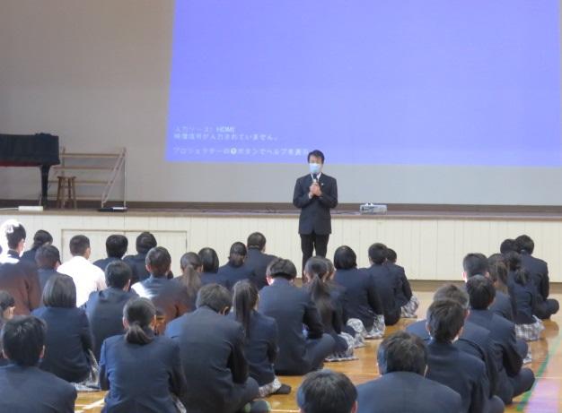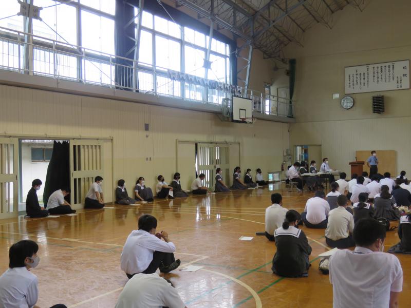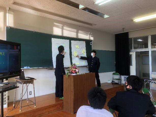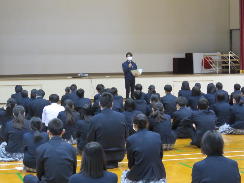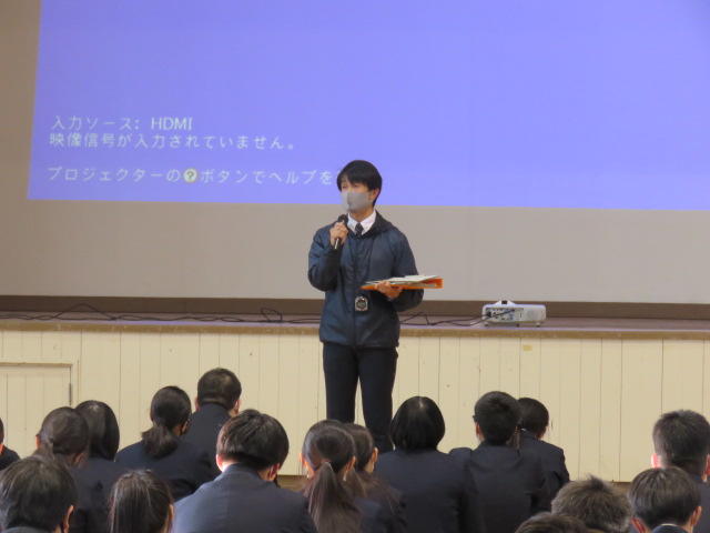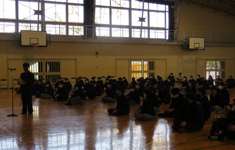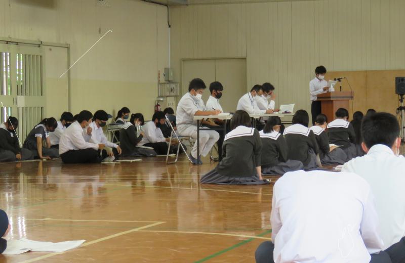 令和3年度の生徒総会を開催しました。今年度の生徒会月別活動目標を説明し、昨年度の行事や予算の執行報告等があり、今年度の行事計画や予算案を提示し、拍手を持って承認していただきました。