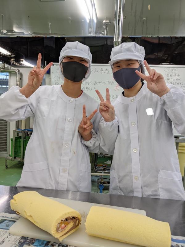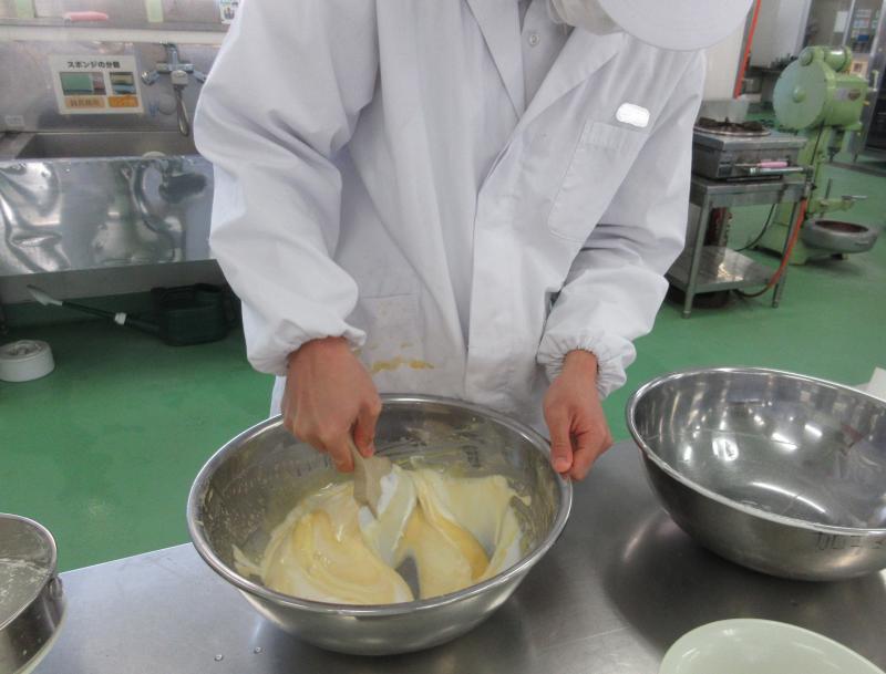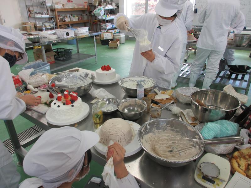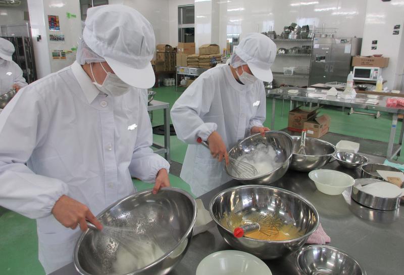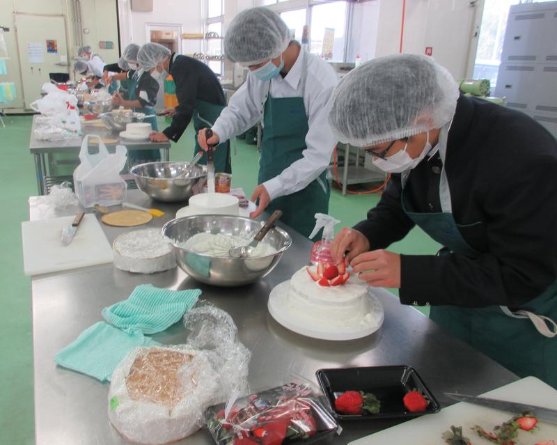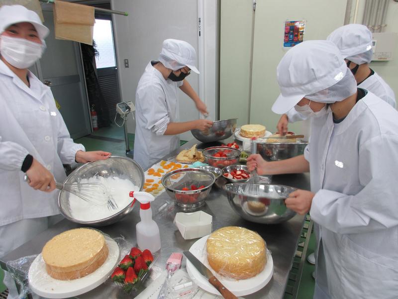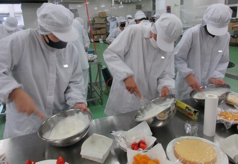 実際に生徒たちはロールケーキづくりに挑戦しました。生地づくりからフルーツを切って生クリーム、チョコレートクリームを塗ってフルーツを挟んで巻く所が一番難しそうでした。