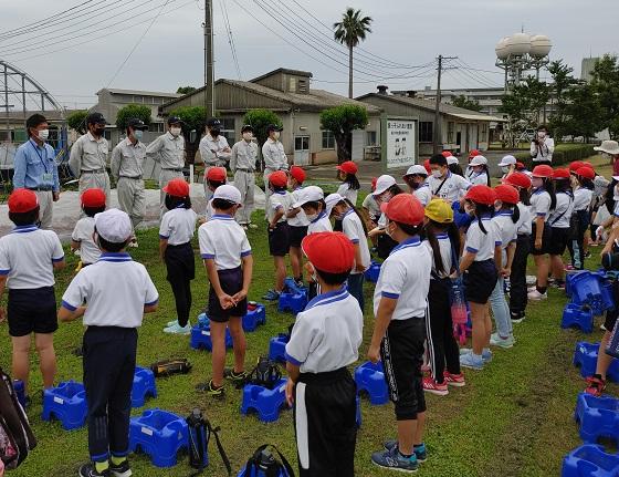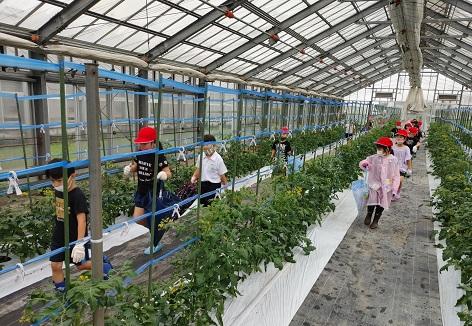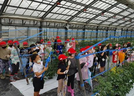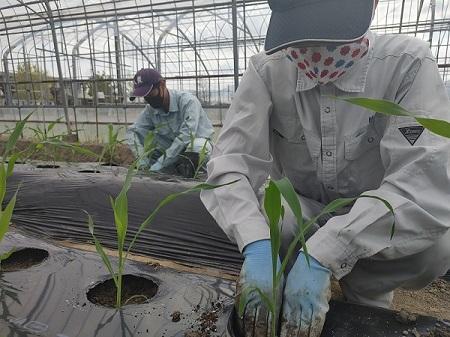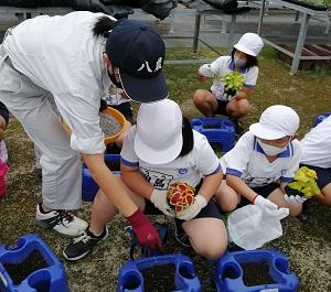 オクラの植え付けでは本校2年生の野菜専攻生6名が小学生に教えながらオクラの苗を植えました