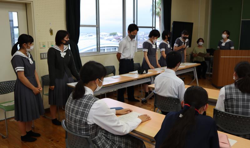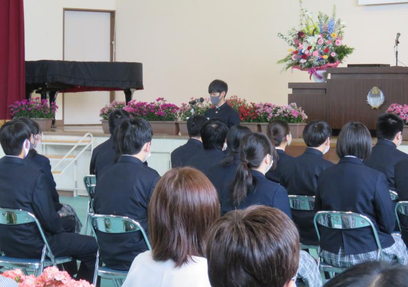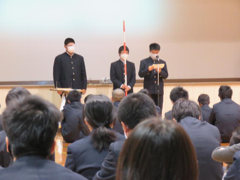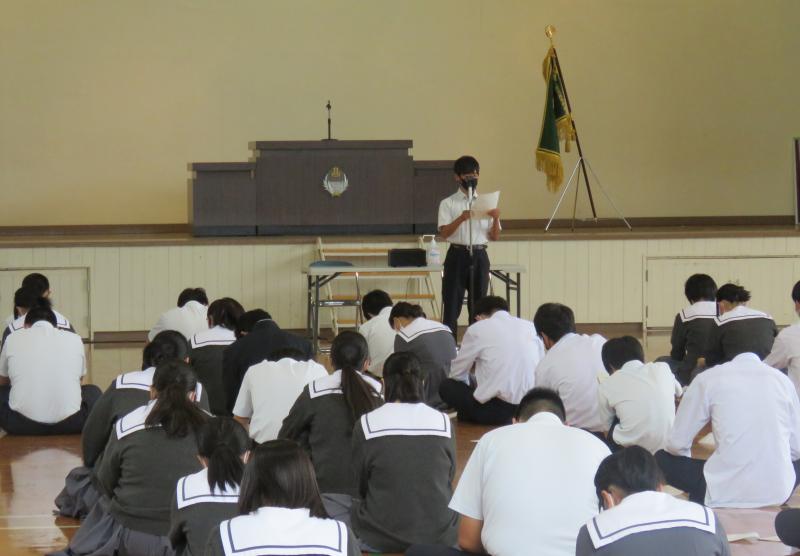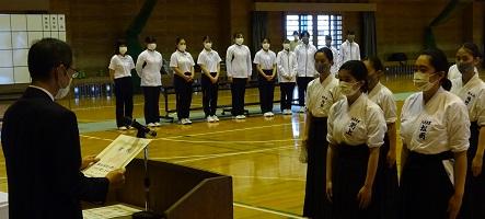 生徒総会後、高校総体・総文祭に向けて選手推戴式が行なわれました。各部のキャプテンや部長から試合に向けての意気込みを話してもらい部員の士気を高め、明日の勝利を願っていました。