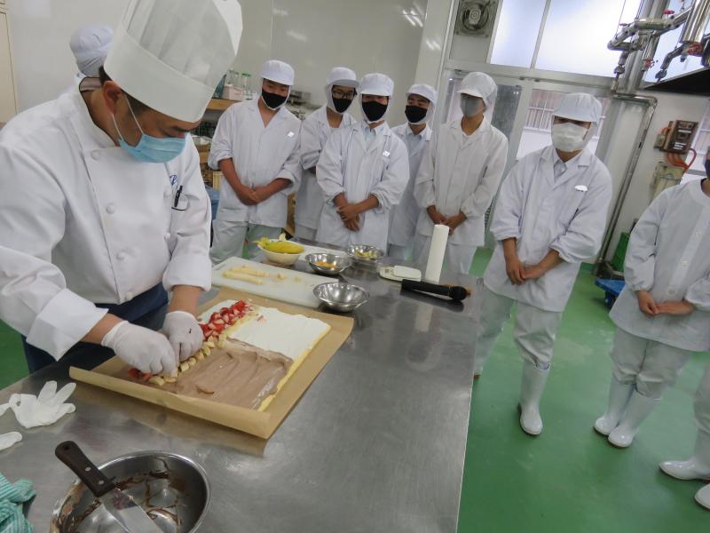 5月26日(水)1年食品科学科の生徒たちが、厚生労働省の事業の一環『ものづくりマイスター』を活用し、洋菓子部門のプロの方(熊本市 パティスリービジュー オーナーシェフ 松尾先生 )を八農に直接お招きし、プロの技や技術を披露していただきました。