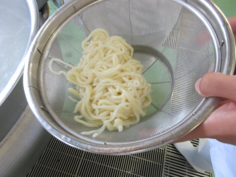 1年園芸科学科の生徒たちが、食品製造の授業でうどんを製造しました。薄力粉、強力粉を合わせ、コネてコネてコネて、薄く延ばしてから、細く切って20分ほどゆでると、ちゃんとこしのあるうどんが完成しました。とても美味しそうでした。