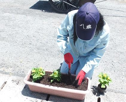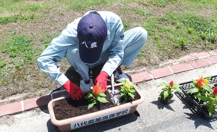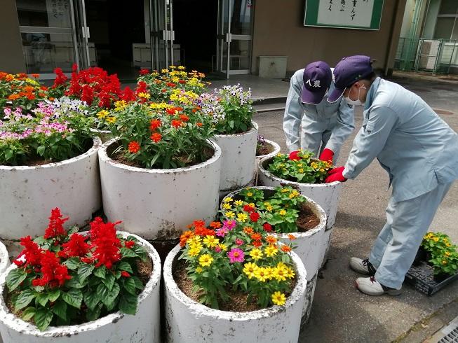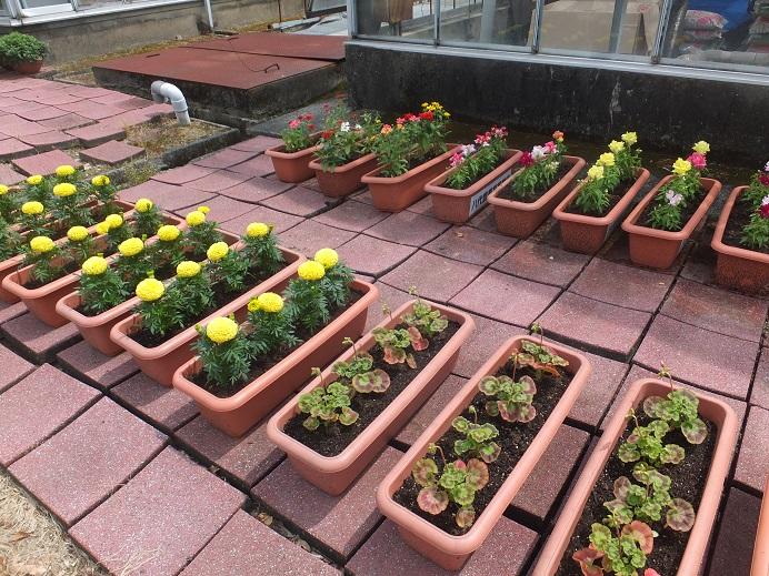 園芸科学科で栽培した草花で校内の花壇やプランターを設置しました。