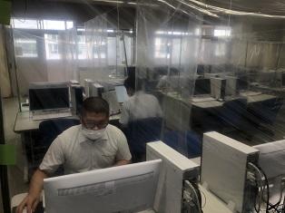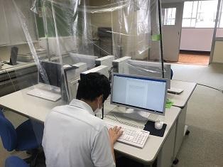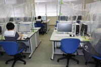 パソコン一台ごとの席をビニールシートで覆い、飛散防止等を行っています