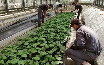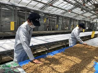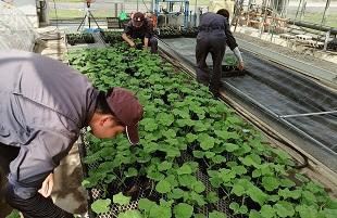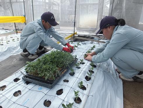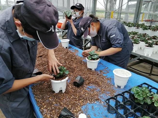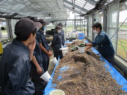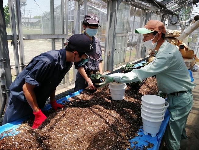 これまで育ててきた苗を最終的に販売するための鉢へ植え替えを行いました。