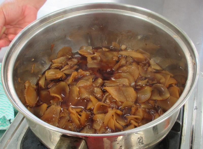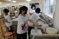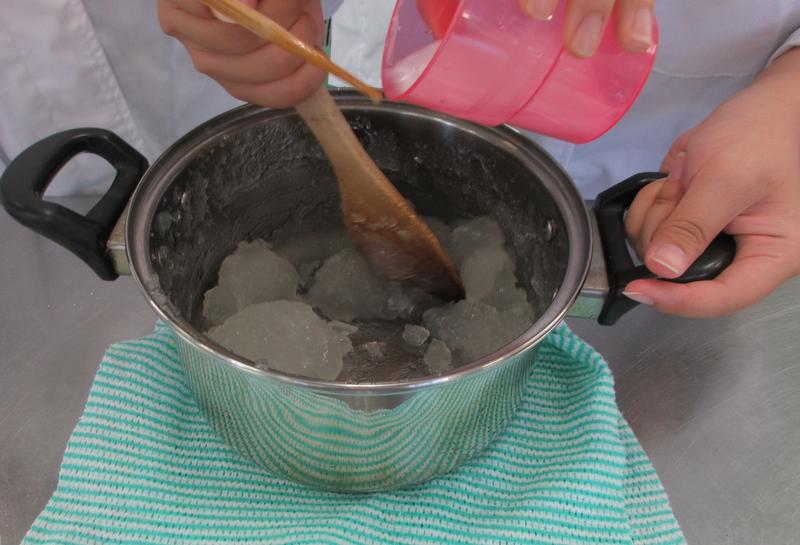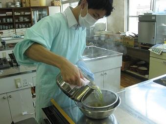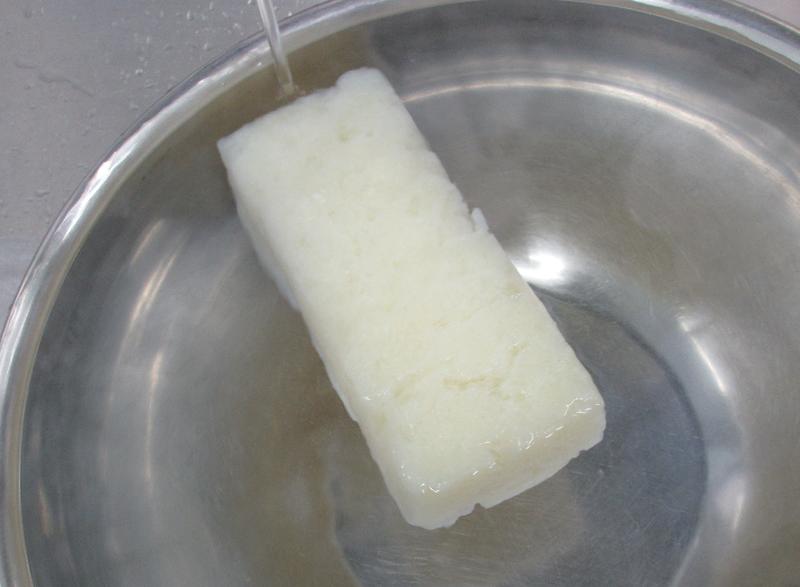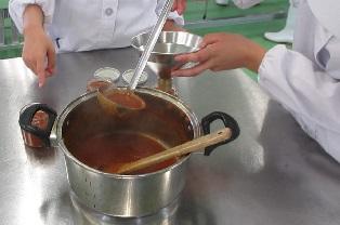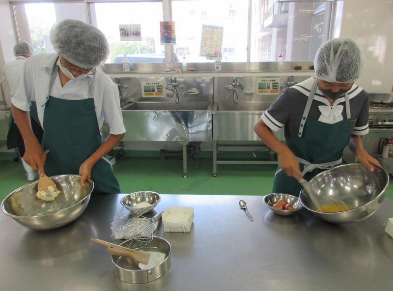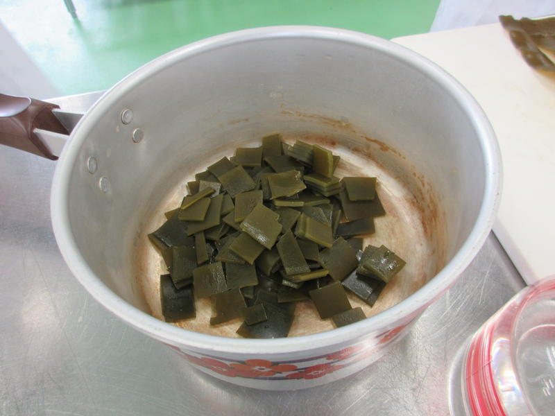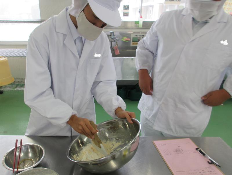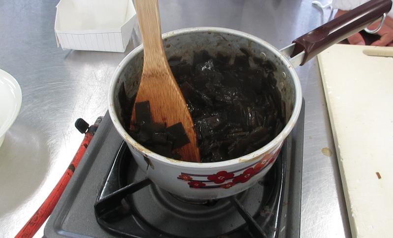 10月6日、3年食品科学科の食品総合実験の時間にこんにゃくを作ってみました。水に溶いたこんにゃく粉を加熱し、ノリ上になったところで水酸化カルシュウムを加えて一塊になったら容器に入れ、15分間茹で、水さらしをすると出来上がりです。