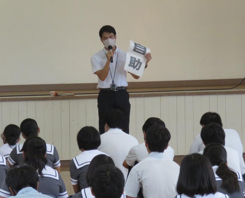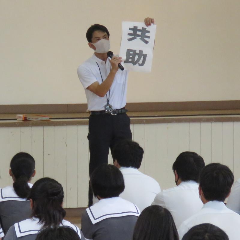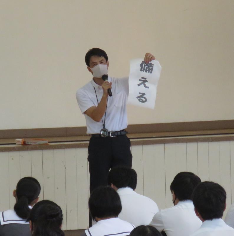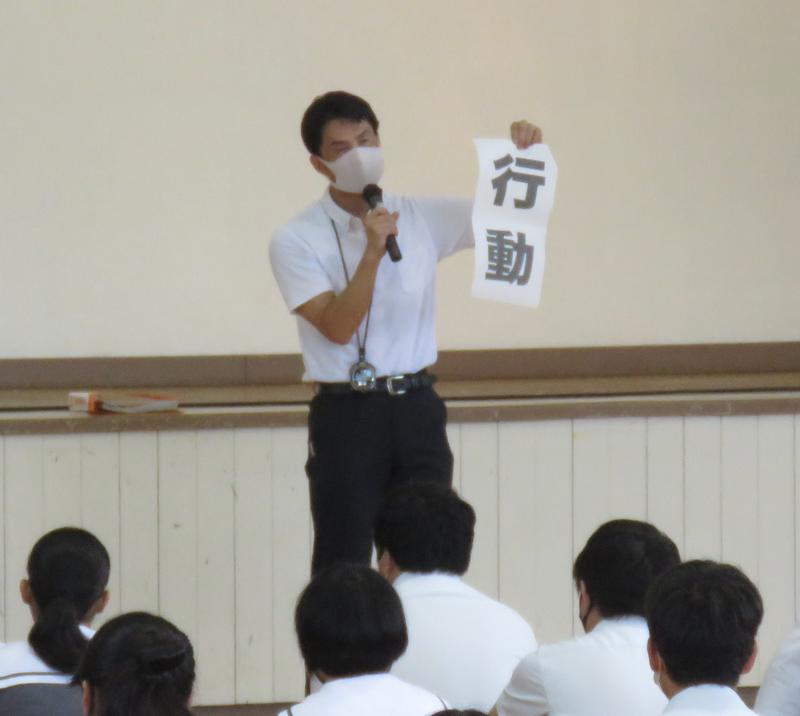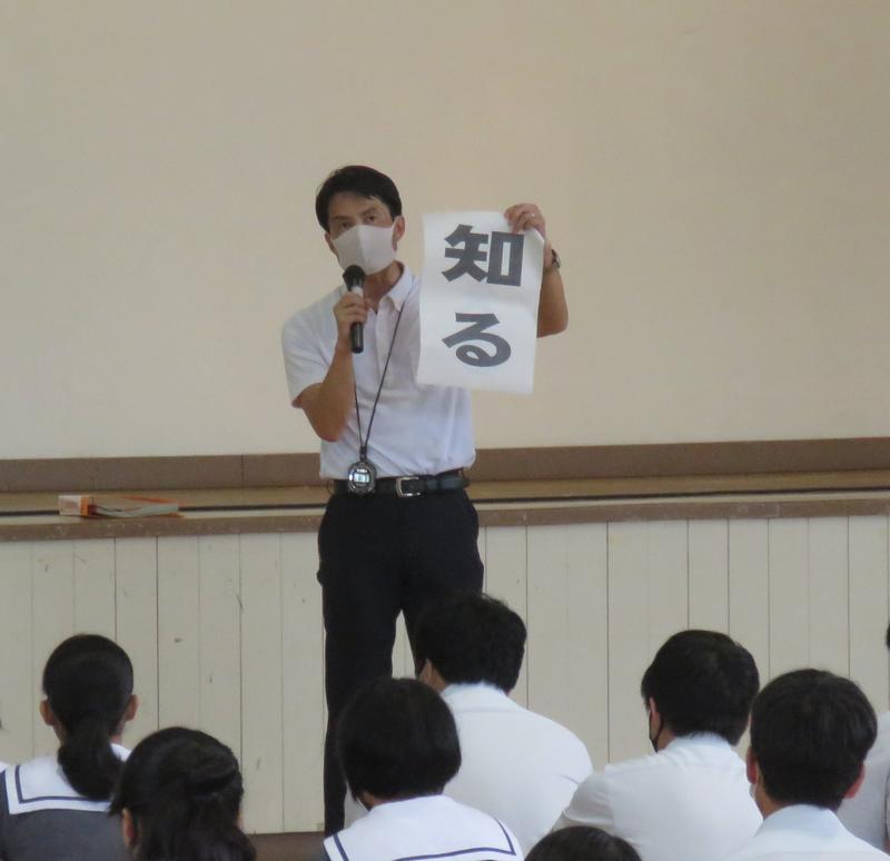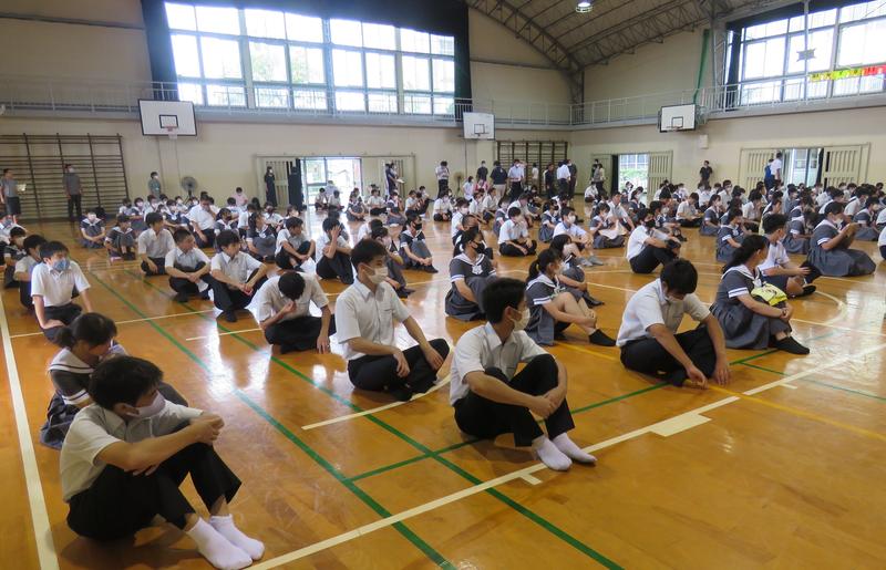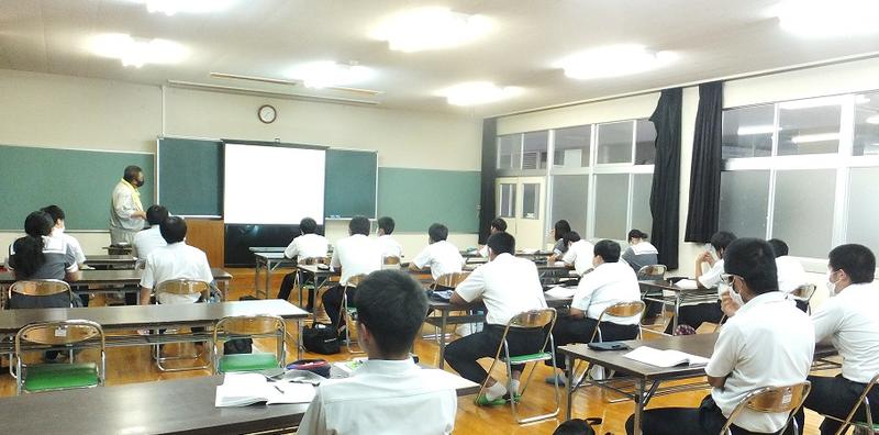 10月1日中間考査の最終日の午後に人権教育講演会を実施しました。ようやくC型コロナウイルス感染症対策に係る熊本県のリスクレベルに ついては【レベル2警戒】に引き下げられましたが、マスクを着用し、間隔を開けてソーシャルディスタンスを維持しつつの講演会でした。