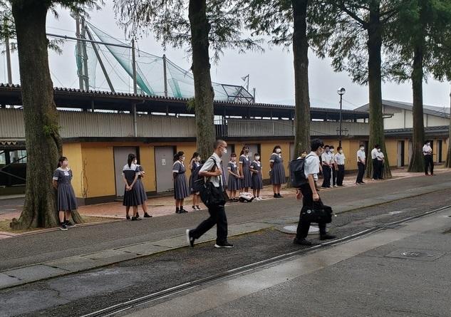 更衣について、活動開始前は、検温を行い、それぞれの部室で更衣を行う。その際、部室使用のルールをしっかり守り顧問の先生の指示に従うこと。活動終了後は、各部室で更衣を行う。活動前と同じように、部室使用のルールをしっかり守り顧問の先生の指示に従って下さい。