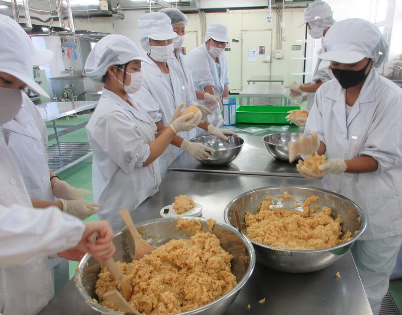3年食品科学科の食品製造コースの生徒たちが、6月下旬に仕込んだ味噌が3ヶ月の熟成後、おいしい味噌に仕上がりました。樽の上の方の味噌と下の方の味噌をボールで半分ずつ混ぜ合わせることで、全体にうまみが混ざり合うことが味噌です。