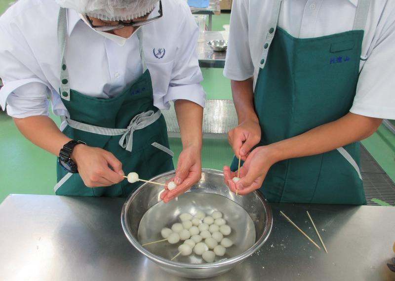 1年園芸科学科の生徒たちが、食品製造の授業で上新粉と白玉粉の違いを学習し、みたらし団子を製造しました。2班ぐらいが耳たぶぐらいの柔らかさをとおり越してしまいましたが、ちゃんと丸めることができ、団子にすることができました。