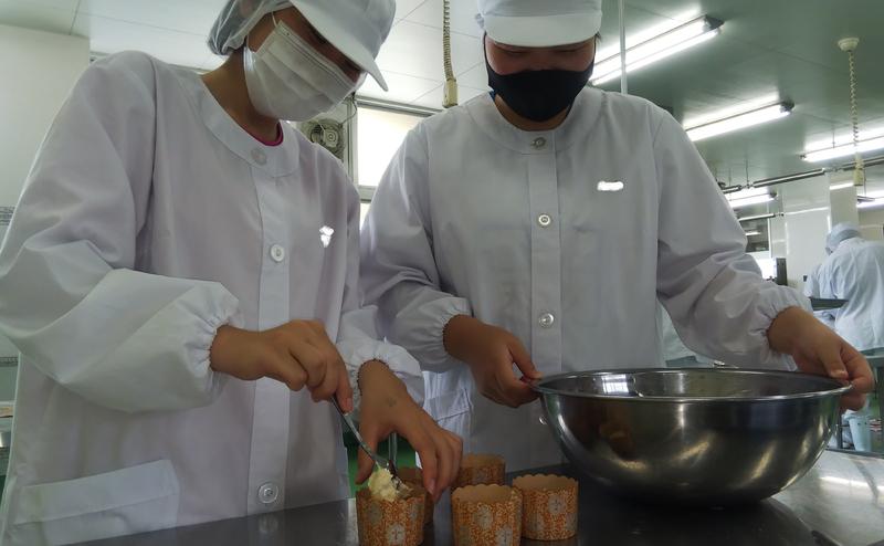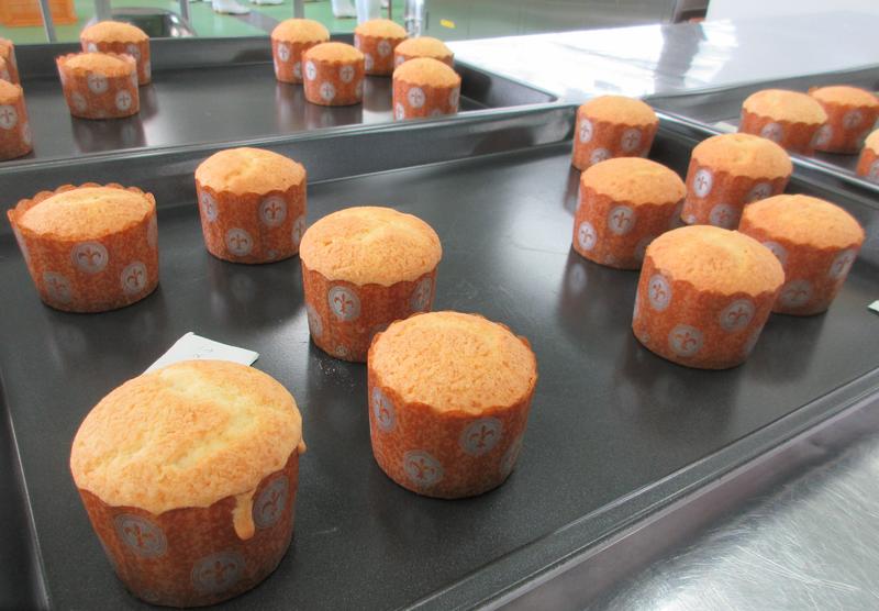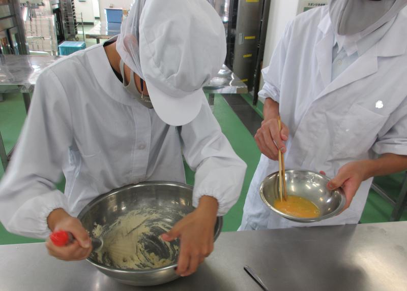 10月8日、1年食品科学科前半の生徒が食品製造の授業でイングリッシュマフィン(Eーマフィン)を製造しました。何回か混ぜ合わせる工程がありましたが、全員失敗することなく、上手にカップに注ぎ分けて焼くとめちゃめちゃ膨張し、ふわふわのEーマフィンができました。
