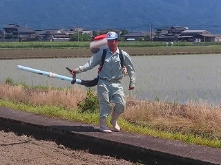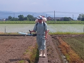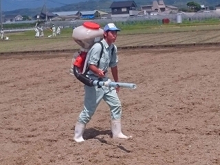 梅雨とは思えない青空の下、水田に元肥をまきました。