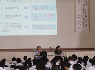 最初『デートDVとは』ということで、生徒たちの身近なところから、いろんな場面や生徒間の関係についての問いかけや、よりよい関係の築き方などを話されました。