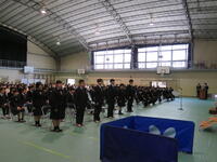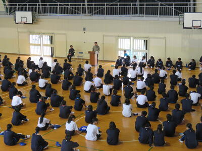 生徒の人数確認・安全確認が終わってから、体育館で消防職員の方より指導・講評・講話が行われました。