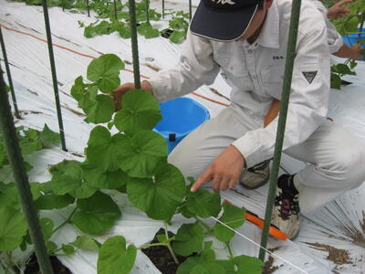 園芸科学科の生徒がメロンを栽培しているハウスに来ると