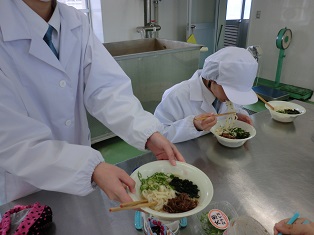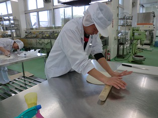 3月2日(金)に1年食品科学科の生徒たちが、うどん作りに挑戦しました。手でこねた後、足で踏んでコシを出しました。薄く伸ばして、できるだけ細く切るように頑張っていました。できばえは、見ての通り美味しそうにできました。
