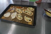 二次発酵後、用意されたソースやホウレン草やチーズなどを乗せて、焼きます。