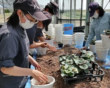 これまで育ててきた苗を最終的に販売するための鉢へ植え替えを行いました。