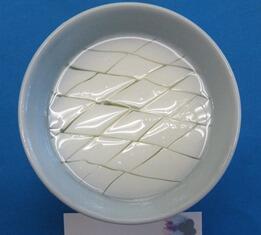 牛ない豆腐は、最後にナイフで切れ目をいれて菱形にするのが難しいのです。シロップを入れて浮き上がってきたら完成です。