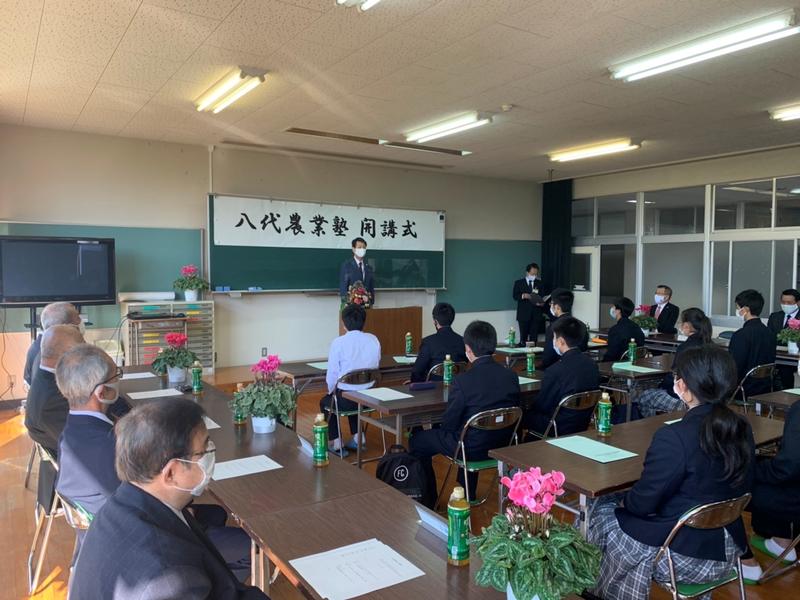 11月21日10時から、本校農場センターで「八代農業塾」の開講式が行われました。主催者として、塾長の市長(代理副市長田中浩司様)と本校校長、農林水産部長 沖田良三様に政策課課長、来賓として県南広域本部 農林水産部長 高野 真様 並びに八代市担い手育成協議会の皆様においでいただきました。