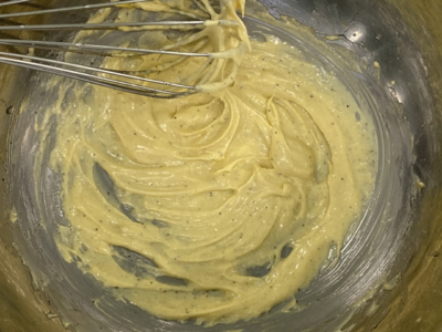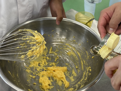②サラダ油をさらに少しずつ入れていくと、だんだん私達がよく知るマヨネーズに近づいていきます。