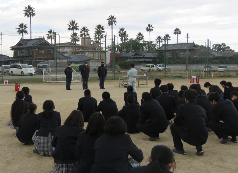 八農では震度5強の地震が発生し、1階調理室から火災が発生したとの想定で避難訓練を開催しまた。生徒たちは、出火した所を避け、グランドの方へ避難しました。消防署の方から「おさない」「かけない」「しゃべらない」「もどらない」を注意して避難してくださいとの講評をいただきました。