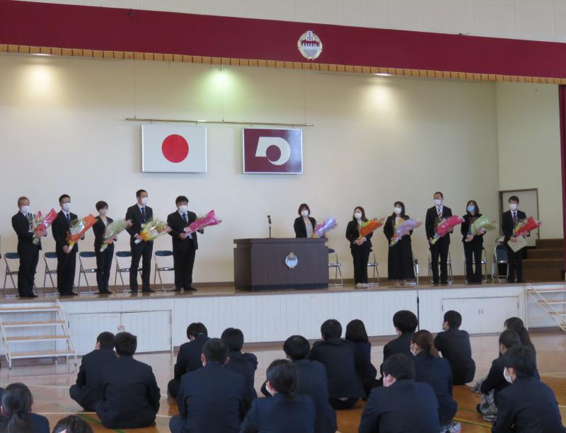転退任の先生から一言ずつご挨拶をいただきました。その後、生徒を代表して、生徒会長の白石君がユーモアを交えて、感謝とお別れの言葉をのべました。最後に転退任の先生方一人一人へ花束を渡しました。