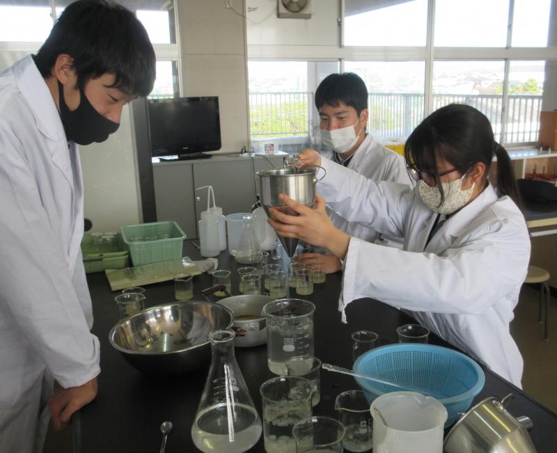 3月3日に2年食品科学科の生徒たちが、アルギン酸ナトリウムを使い酵母の固定化実験をおこないました。これは、酵母を固めることにより連続して糖液を発酵させることができるようになるのが目的です。