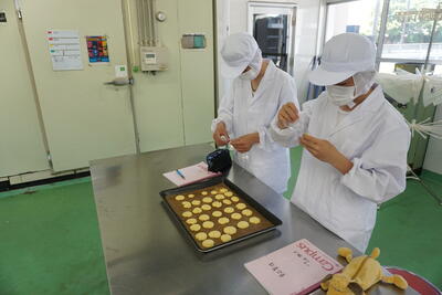 初めての食品製造の実習で、先生の手本を参考にクッキーを絞っていきます。