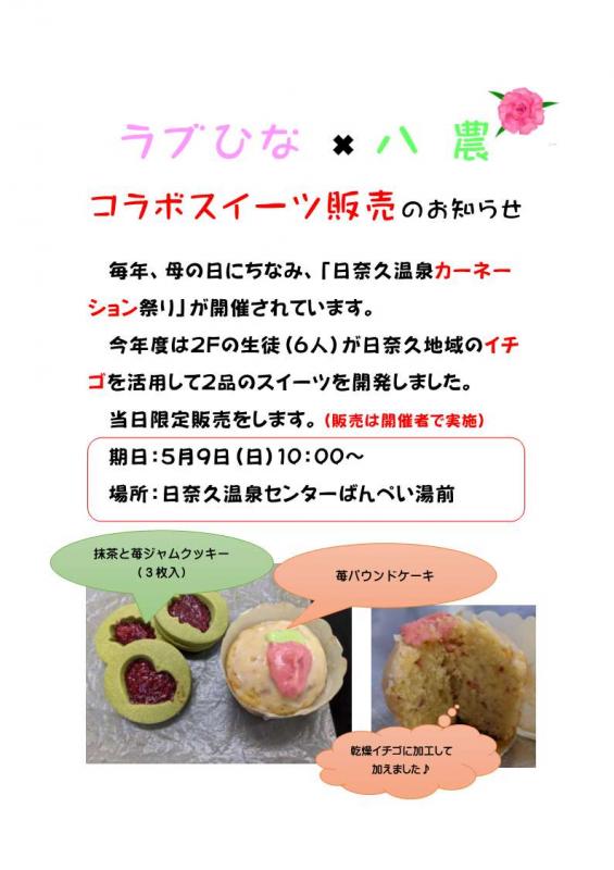 5月9日(日)に日奈久温泉センターばんぺい湯前で生徒たちが開発したスイーツを販売しました。例年、生徒たちが販売までを行なっていましたが、コロナウイルス感染拡大防止のため、イベント担当者の方が販売されました。